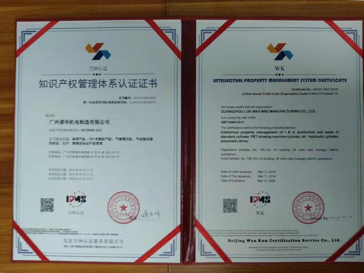 2019年03月14日,广州诺华机电制造有限公司(以下简称 “公司”)收到 北京万坤认证服务有限公司 2019年03月11日签发的《知识产权管理体系认证证书》(证书号码:404IPL190272ROS),通过认证的范围如下:标准气缸、PET吹瓶机气缸、气液增压缸、气动驱动器的研发、生产、销售的知识产权管理。初次发证日期:2019年3月11日,有效期至:2022年03月10日。 此次《知识产权管理体系认证证书》的取得,表明公司的知识产权管理体系符合 GB/T29490-2013标准及相关要求,有利于进一步提升公司的知识产权管理能力和企业核心竞争力,特此公告。